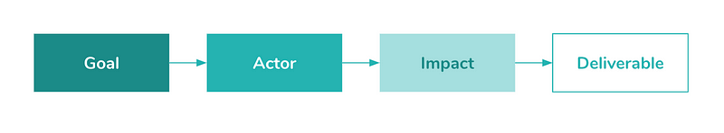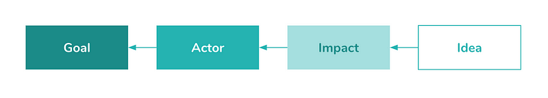 For this framework we’ll use Impact Mapping in the opposite way; to thoroughly validate ideas that may have come from the business, team or customers. Here is the basic layout of the Impact Mapping tool: